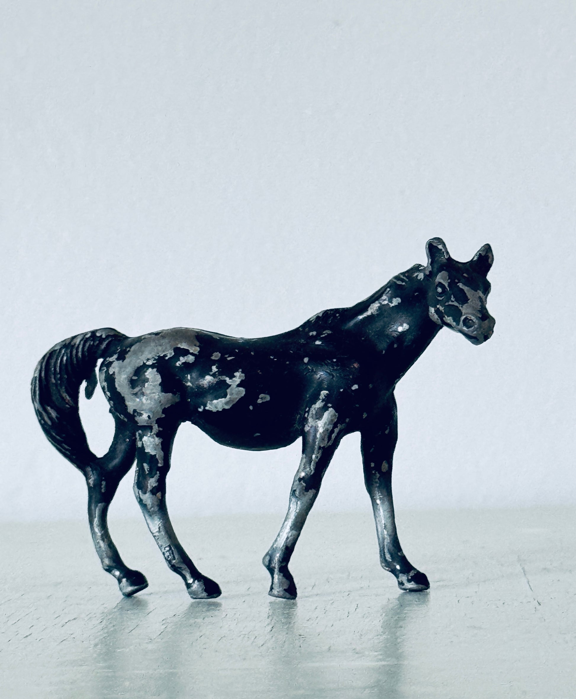 Set of 2 lead toy horses with wear. The black horse is marked made in Hong Kong and the yellow-saddled horse is marked made in USA. Well-loved and interesting decorative elements.