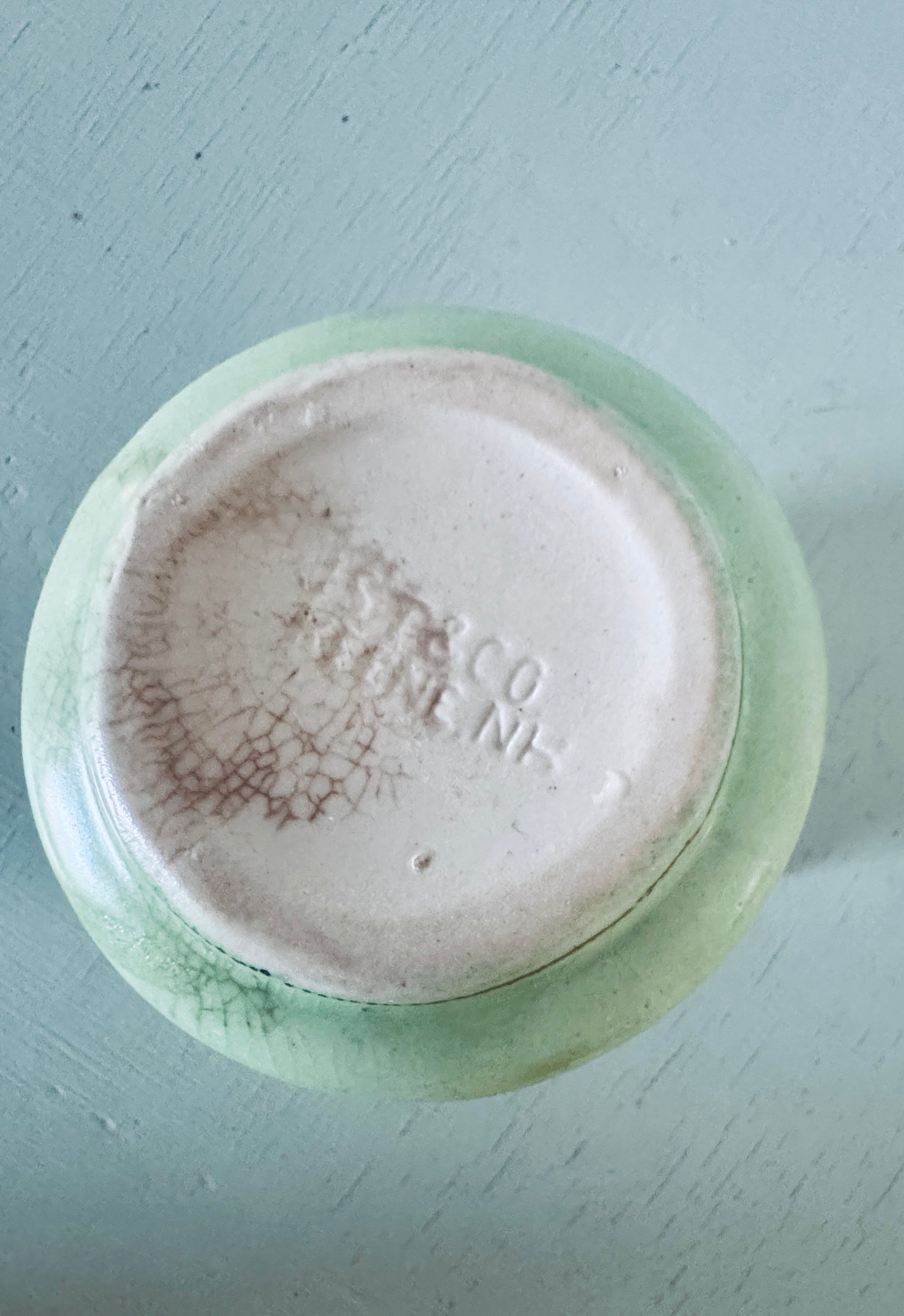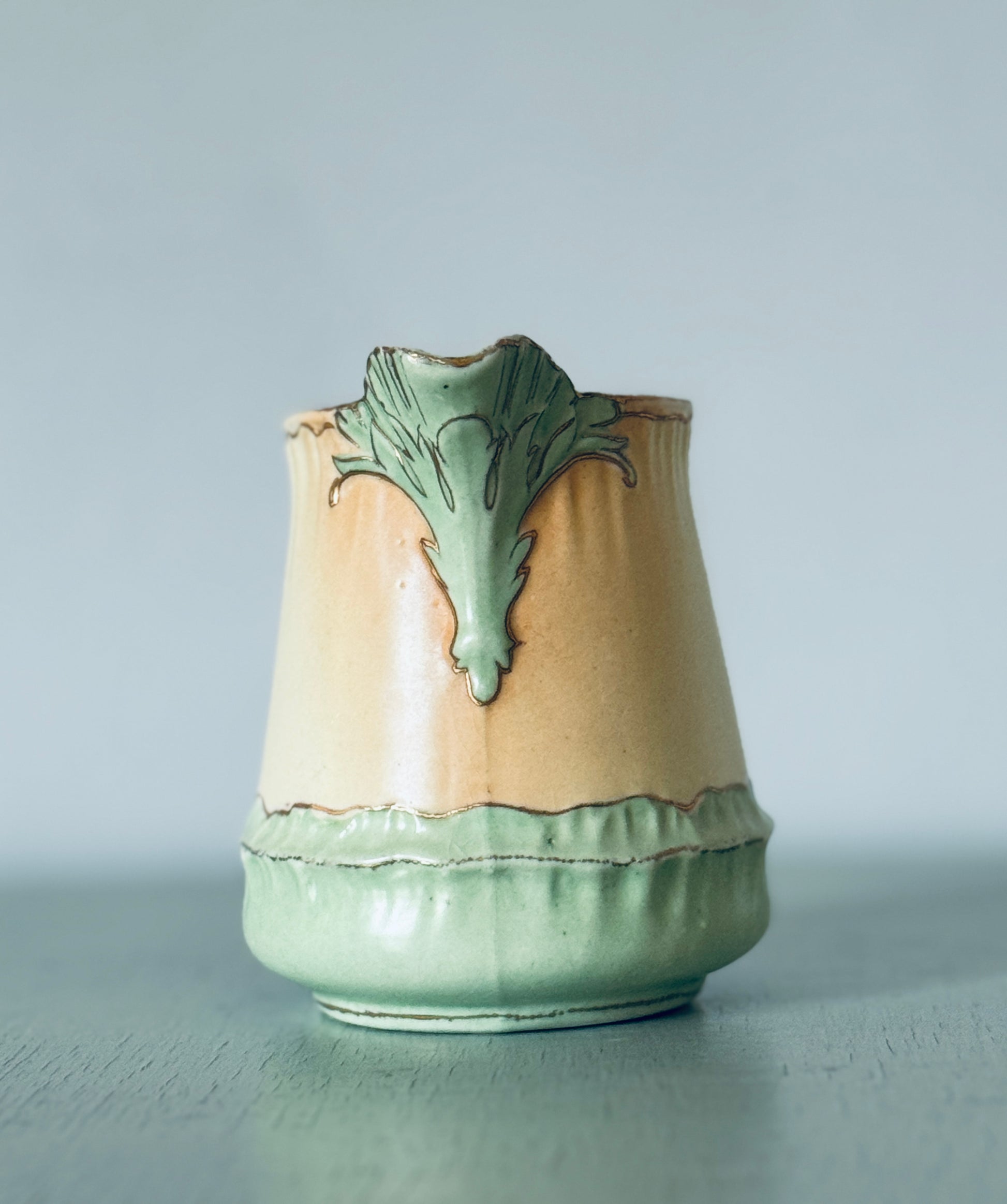 Antique sweet, pale yellow and green gilt leaf motif ceramic pitcher or creamer in good condition with some crazing. Stamped JST & Co Keene, NH. Height: 3 1/2"