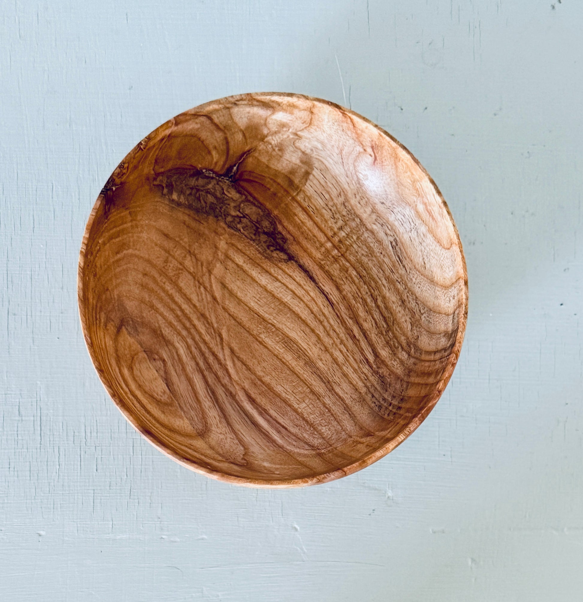 This hand-turned figured maple bowl features a thin, elegant profile and a naturally warm finish. Crafted from premium American maple, it’s lightweight, minimal, and beautifully suited for styling, serving, or everyday display. A refined wooden bowl made to last. Diameter: 6 1/4". Beeswax finish.