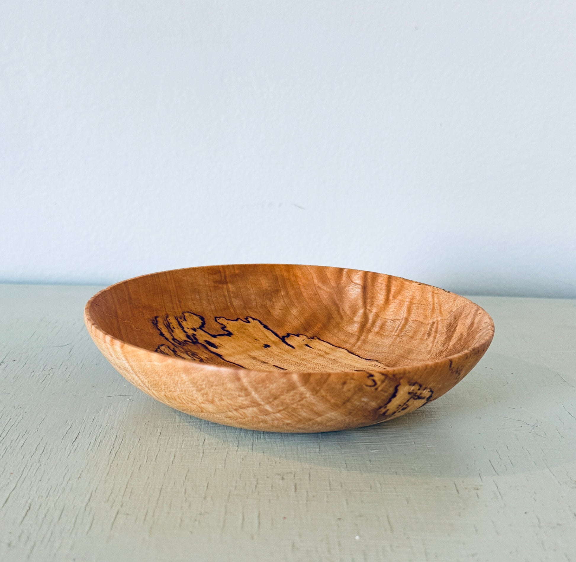 This hand-turned spalted curly maple bowl features a thin, elegant profile and a naturally warm finish and inverted foot. Crafted from premium American maple, it’s lightweight, minimal, and beautifully suited for styling, serving, or everyday display. A refined wooden bowl made to last. Diameter: 5 3/4" Beeswax finish.