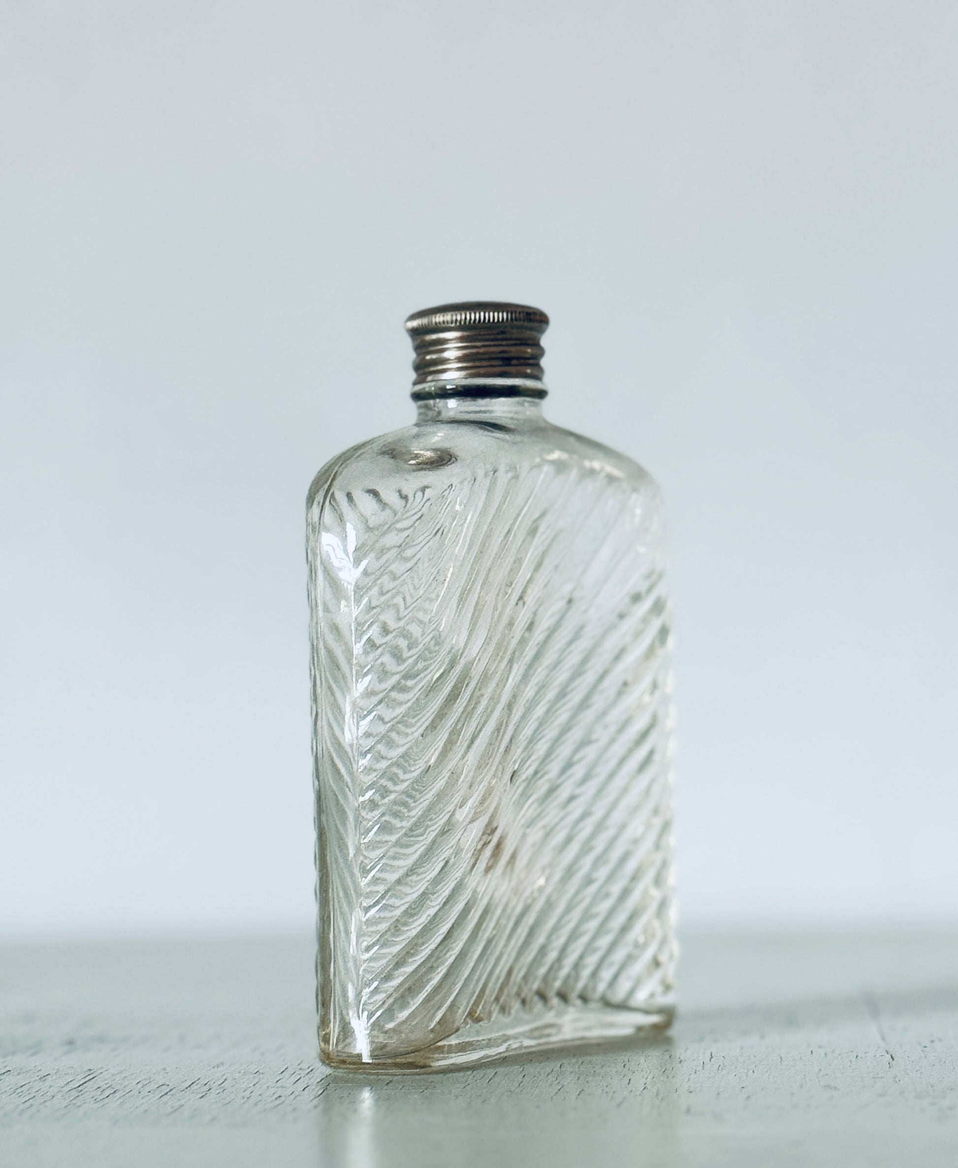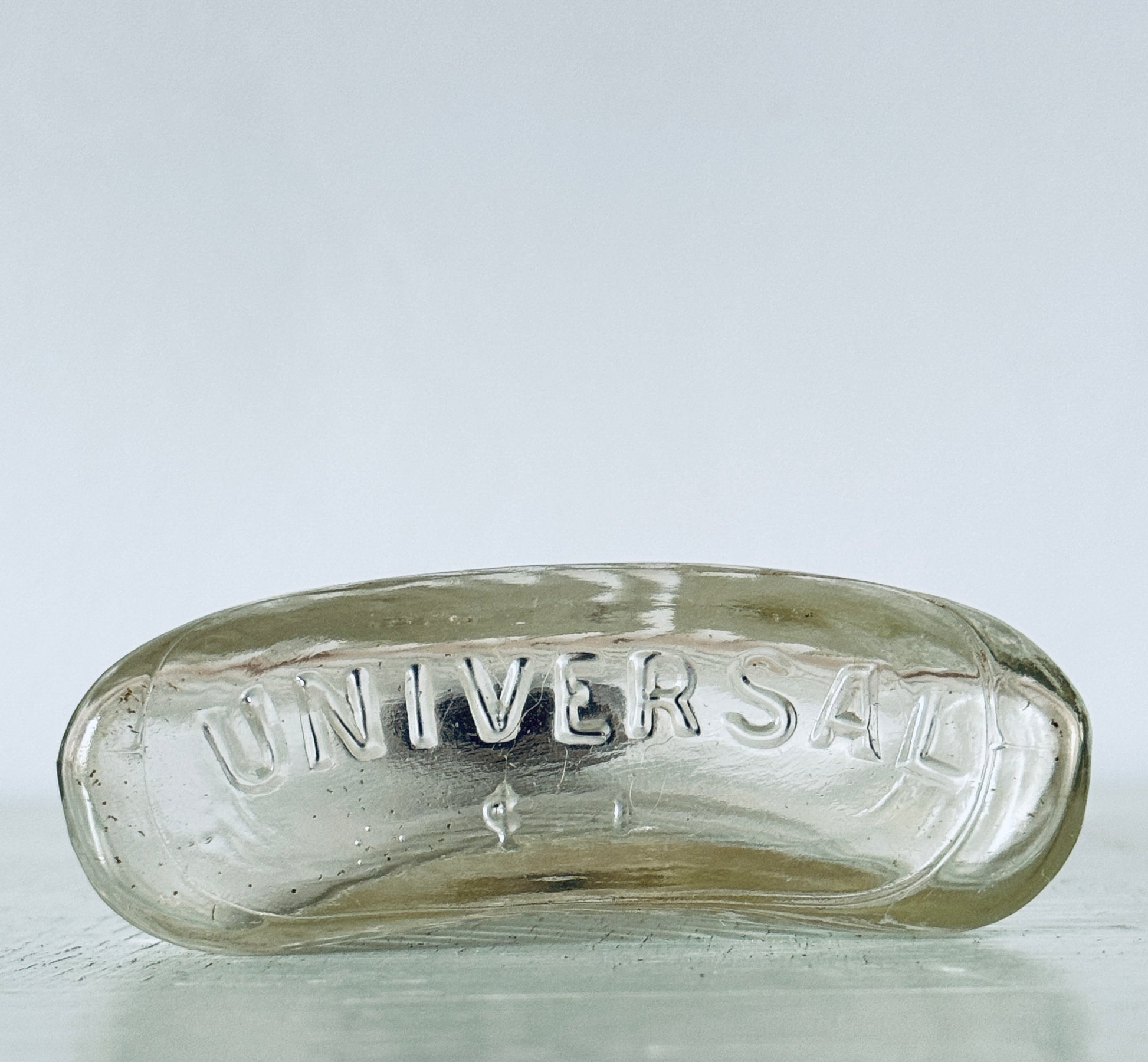 Vintage Art Deco Universal glass hip flask patented on February 8, 1927. It is made of thick, pressed glass with a distinctive diagonal linear pattern. The flask features a silver-colored metal screw top. The concaved shape of the flask was designed to fit comfortably in back pocket. It is stamped Universal on the bottom. Height: 5 1/2", width: 3 1/2".